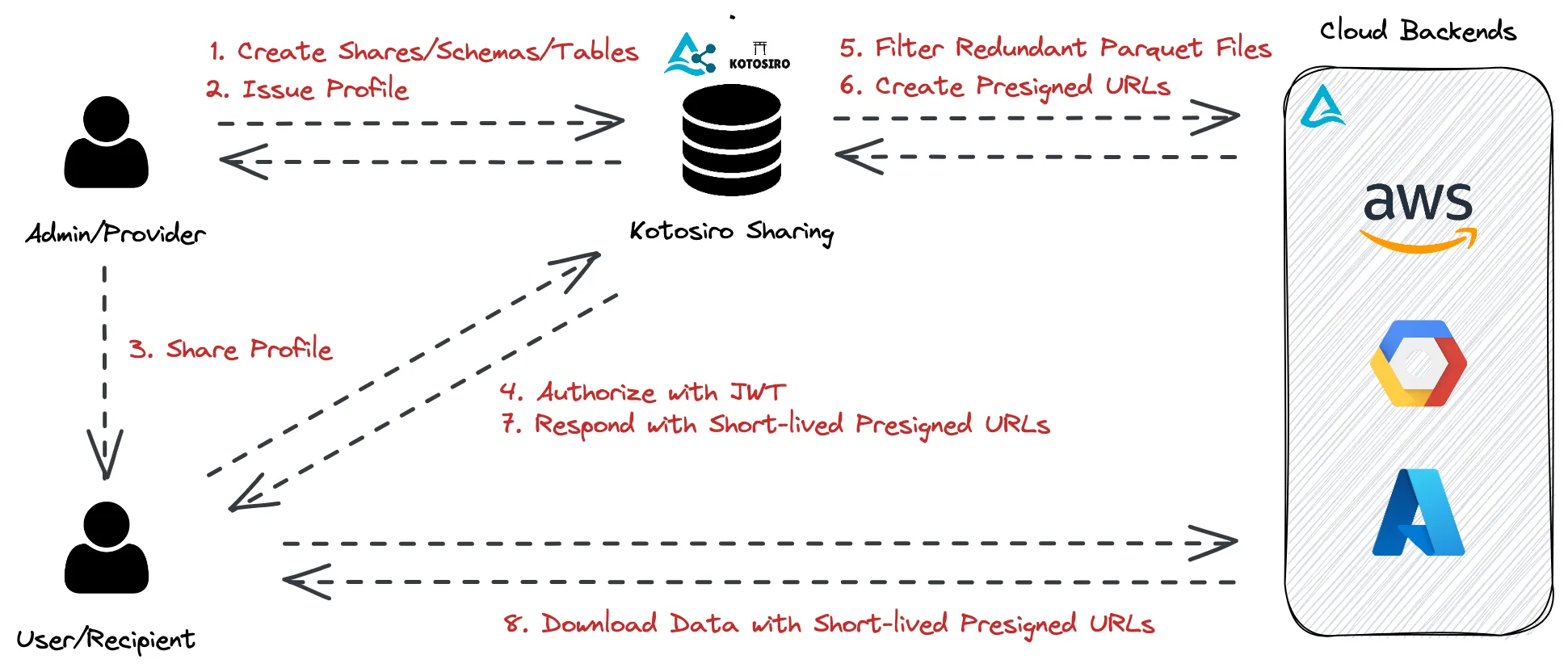 My name is Shingo, creator of Kotosiro Sharing. I am excited to announce the release of Kotosiro Sharing, a minimalistic Rust implementation of the Delta Sharing server aimed at helping engineers easily host their own Delta Sharing service. In this article, I will provide instructions on how to share your data with your colleagues who may have varying technical backgrounds, ranging from data engineers to business intelligence analysts, using self-hosted Kotosiro Sharing server. The instructions are fairly easy and straightforward, and you can easily share your data with colleagues who have different levels of technical expertise. The implementation is currently in the beta phase, and hence, it does not provide a GUI yet. However, this feature will be added in the near future. The following image depicts the system workflow. Let’s walk through how Kotosiro Sharing works when you want to share precious data with your colleagues.