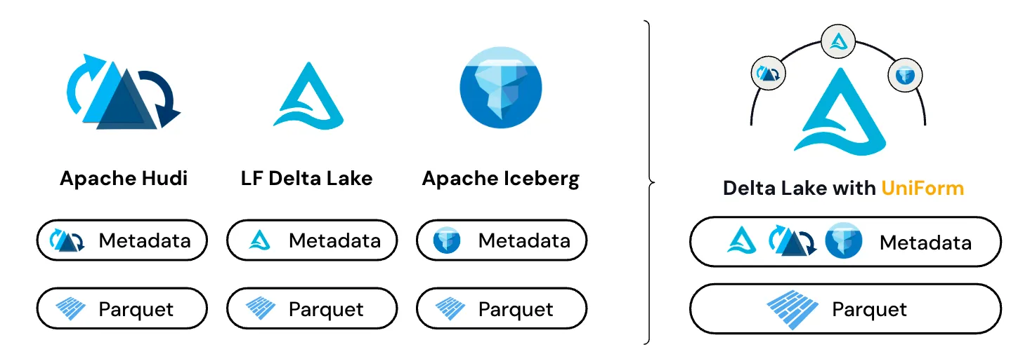 Like Delta Lake, Apache Iceberg and Apache Hudi include metadata on top of Parquet data. Until the release of Delta UniForm, the primary way to operate across table formats was to copy and/or convert the metadata. While this approach is viable, it has a significant drawback in that every change to the Parquet data or one of the lakehouse formats needs to trigger an updated conversion.