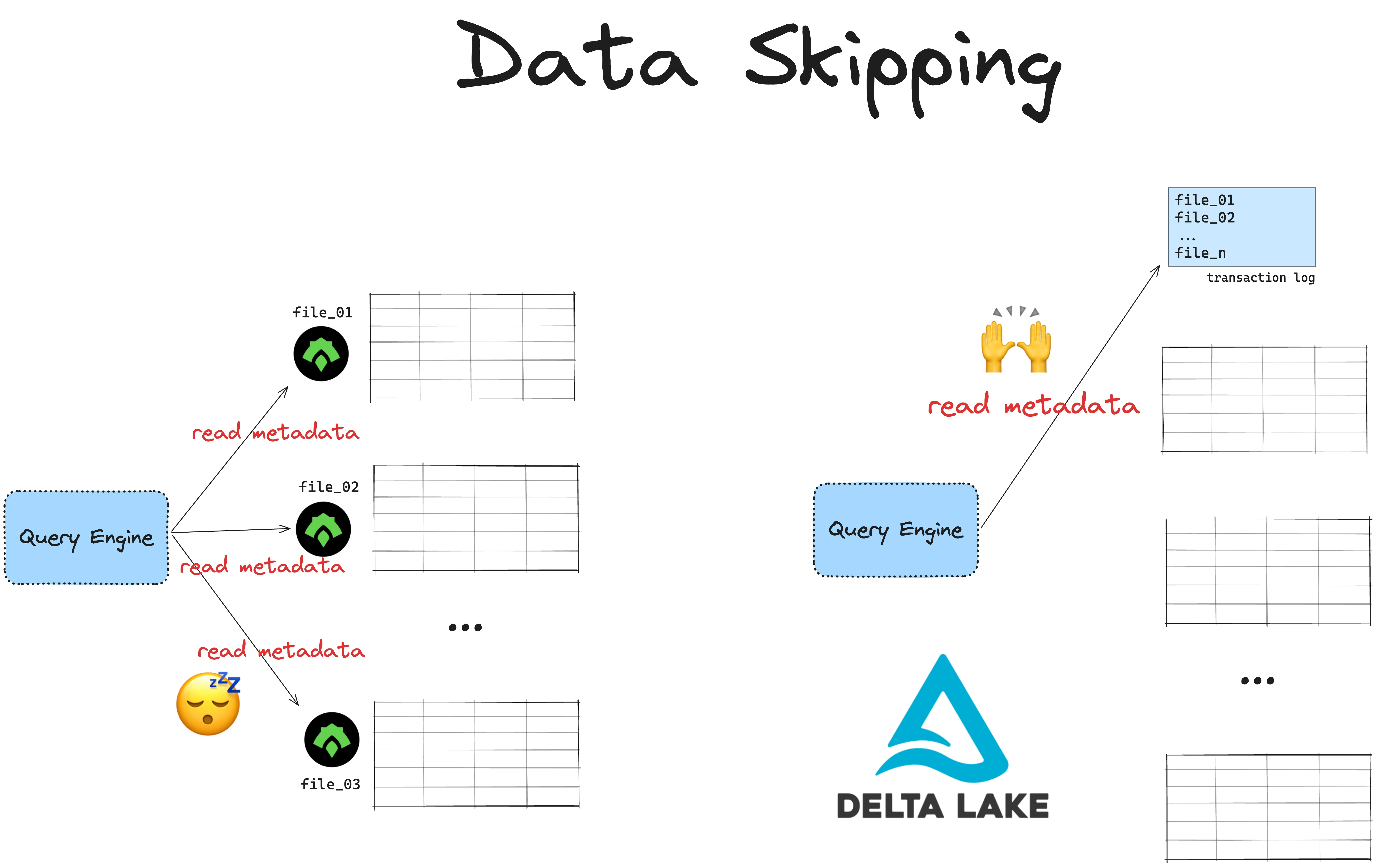 Delta Lake stores all metadata at the table-level in a separate transaction log. Query engines can access all the metadata with a single read and quickly know which data to skip. This is much faster.
